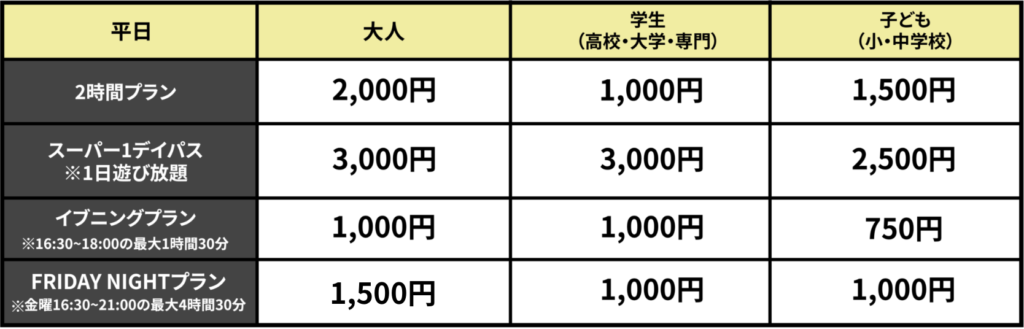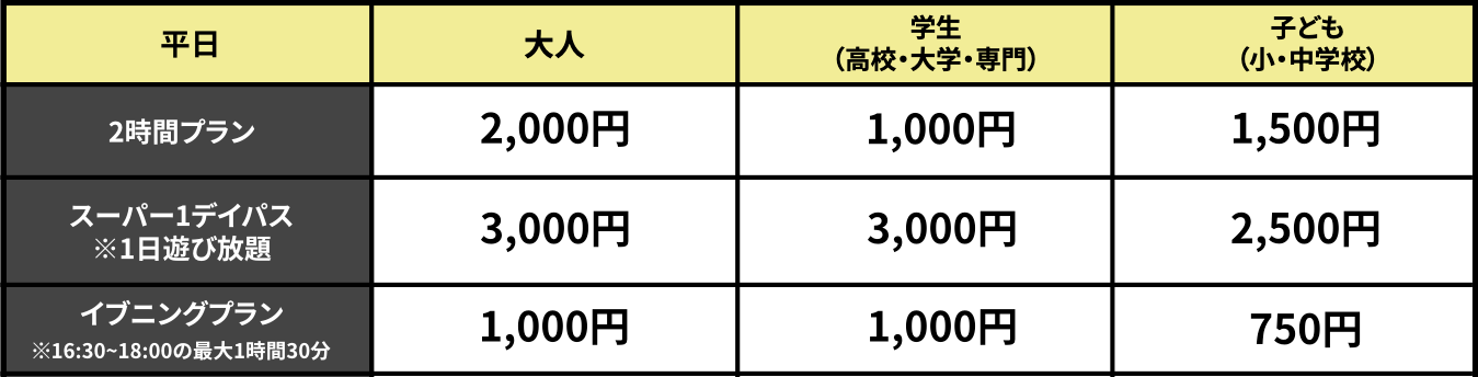 2時間プラン延長料金(30分毎)大人:450円 子ども:250円 大人障がい者:250円 子ども障がい者:100円